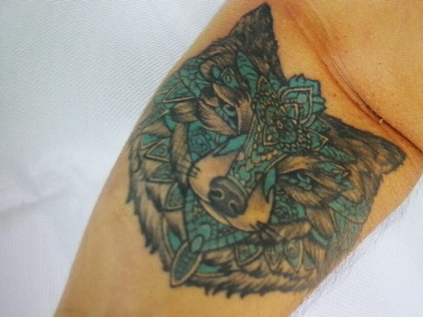 Además, tiene en el antebrazo derecho la cara de un lobo formada por varias figuras en colores turquesa con negro.