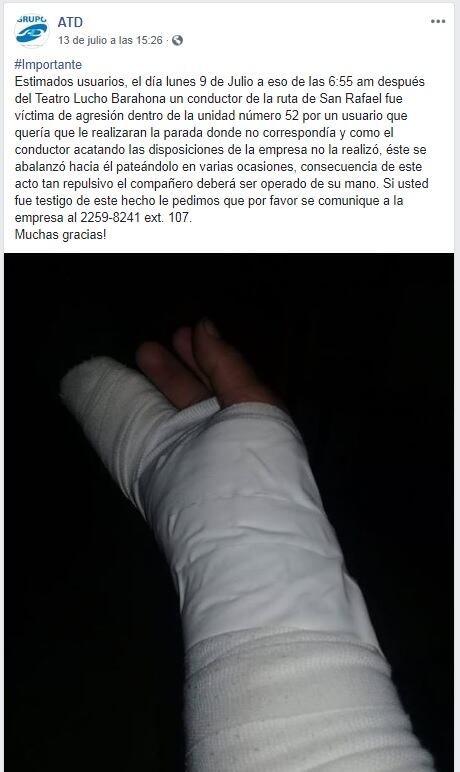 La Teja trató de hablar con algún funcionario de la empresa Auto Transportes Desamparados (ATD), patrona del afectado, para preguntar por qué hicieron al chofer manejar herido, como él lo afirma, y qué pasó con los videos de las cámaras, pero una recepcionista, quien no quiso decir el nombre, señaló que nadie se iba a referir al tema ya que la agresión está siendo investigada por el OIJ.