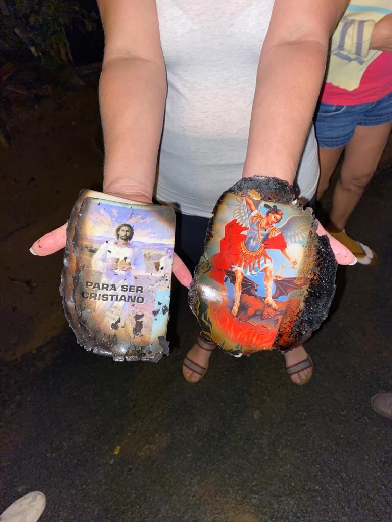 Lo único que no se quemó fueron dos imágenes religiosas que estaban dentro de la vivienda. Los bomberos controlaron las llamas rápidamente y los vecinos pusieron a salvo a los afectados