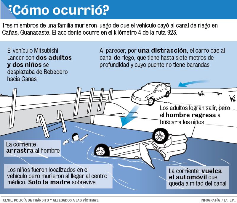 Guido, de 28 años, se encuentra desaparecido desde el lunes a las 6:30 p.m. cuando perdió el control del carro que manejaba y cayó a un canal de riego en Cañas, Guanacaste. En el accidente fallecieron los niños Breiton Hernández Hidalgo, de 7 años, y Joel Santiago Guido Hidalgo, de 2 años (Breiton era hijo biológico solo de Karol; Joel de la pareja).