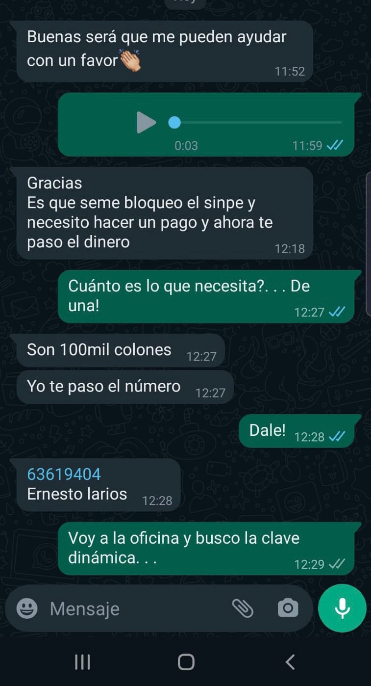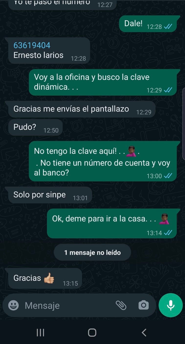 “El gobierno local de Tibás informa que un funcionario municipal fue asaltado y, como consecuencia, a él y a su esposa les robaron el celular. Los delincuentes desbloquearon su celular y han enviado diferentes mensajes a sus contactos, indicándoles que le hagan un SINPE móvil, pero al siguiente número: 6301-9404, a nombre de Ernesto Antonio Larios Sánchez. Situación que es completamente falsa y se trata de un intento de estafa por parte de los antisociales que realizaron el robo”, explicó la Muni