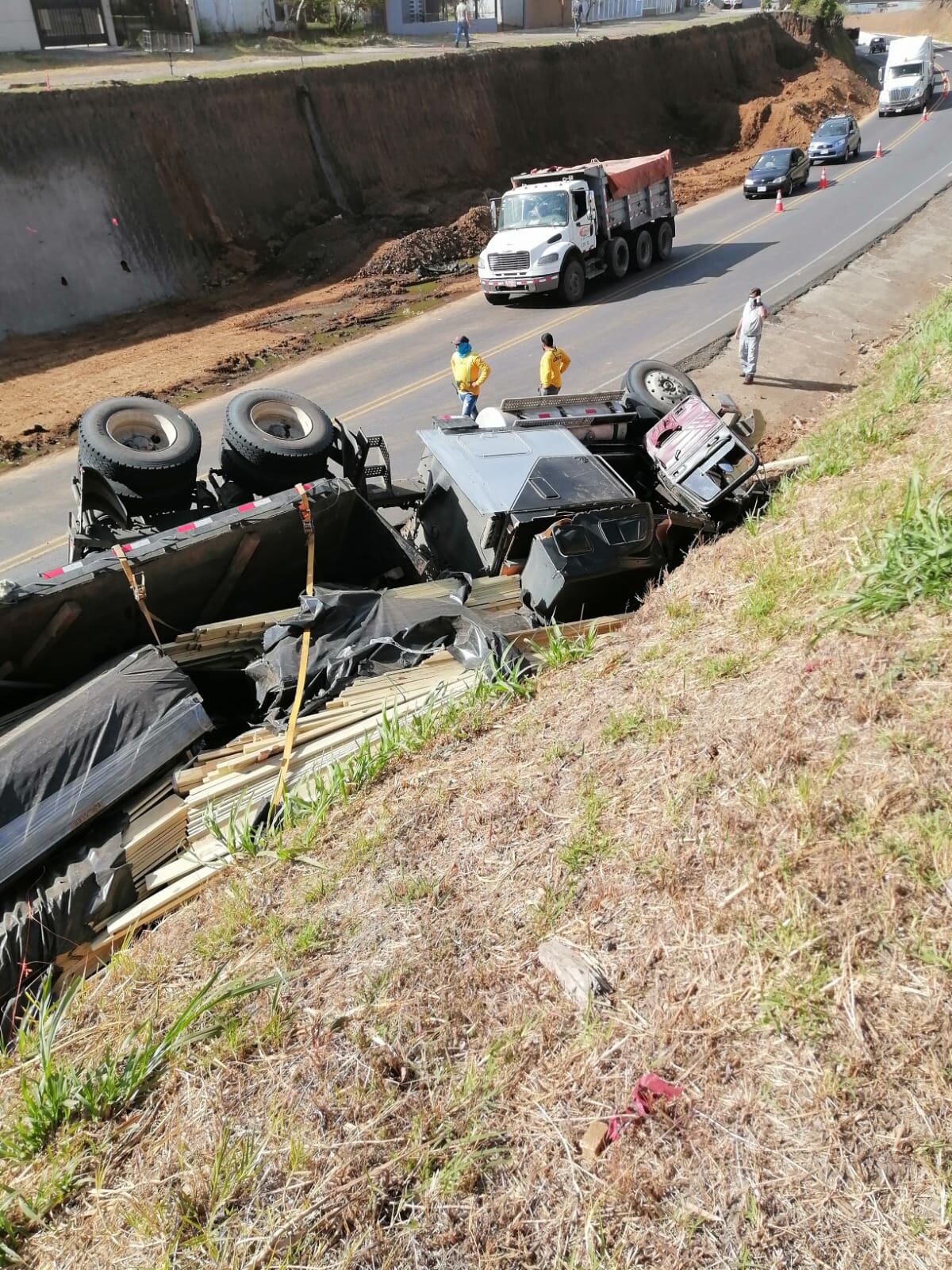 Un cabezal que jalaba materiales de construcción se volcó la mañana de este martes 9 de marzo de Tibás.