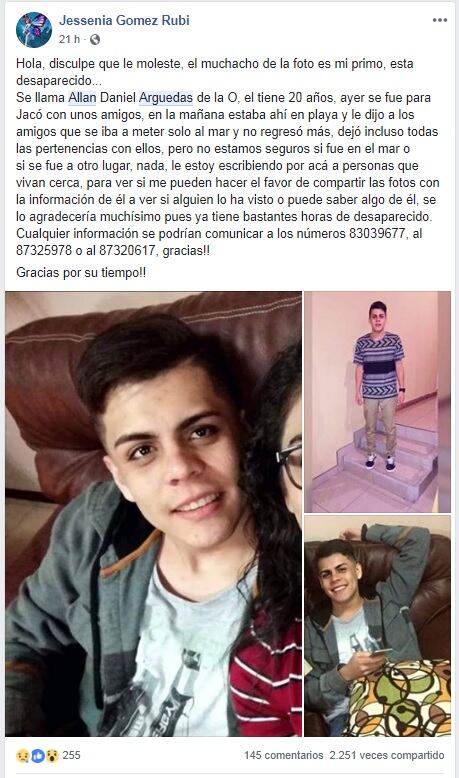 “Pareciera que la desaparición se dio el sábado como a las nueve de la mañana, pero los compañeros de Jacó se dieron cuenta hasta el medio día porque un oficial de la Policía Municipal les contó, incluso el reporte oficial fue hecho por los familiares del muchacho hasta las cuatro de la tarde.