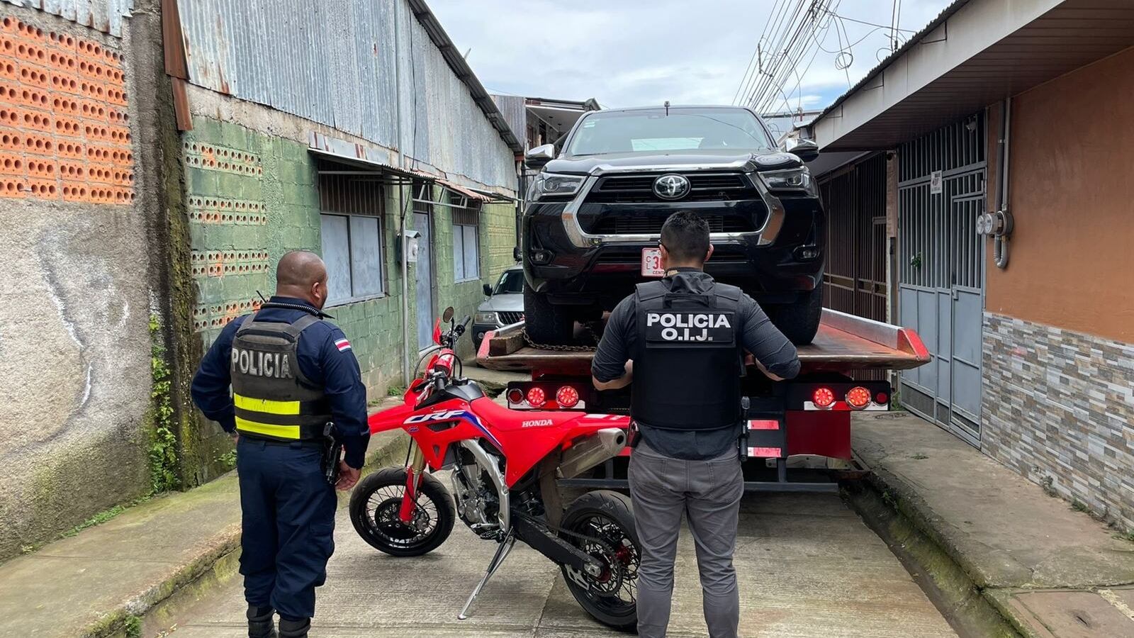 Las autoridades ahora encontraron el carro y además decomisaron una motocicleta Honda de 450 de cilindraje, modelo 2021, denunciada como robada en Aserrí, San José, hace aproximadamente un mes.