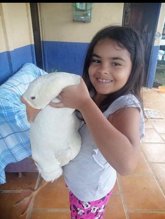La pequeña está muy encariñada con el gansito que es blanquito como una pelotica de algodón. Cuando Victoria anda por la finca, el animalito le anda a la par, hasta trata de meterse a la casa, pero no le dan permiso.