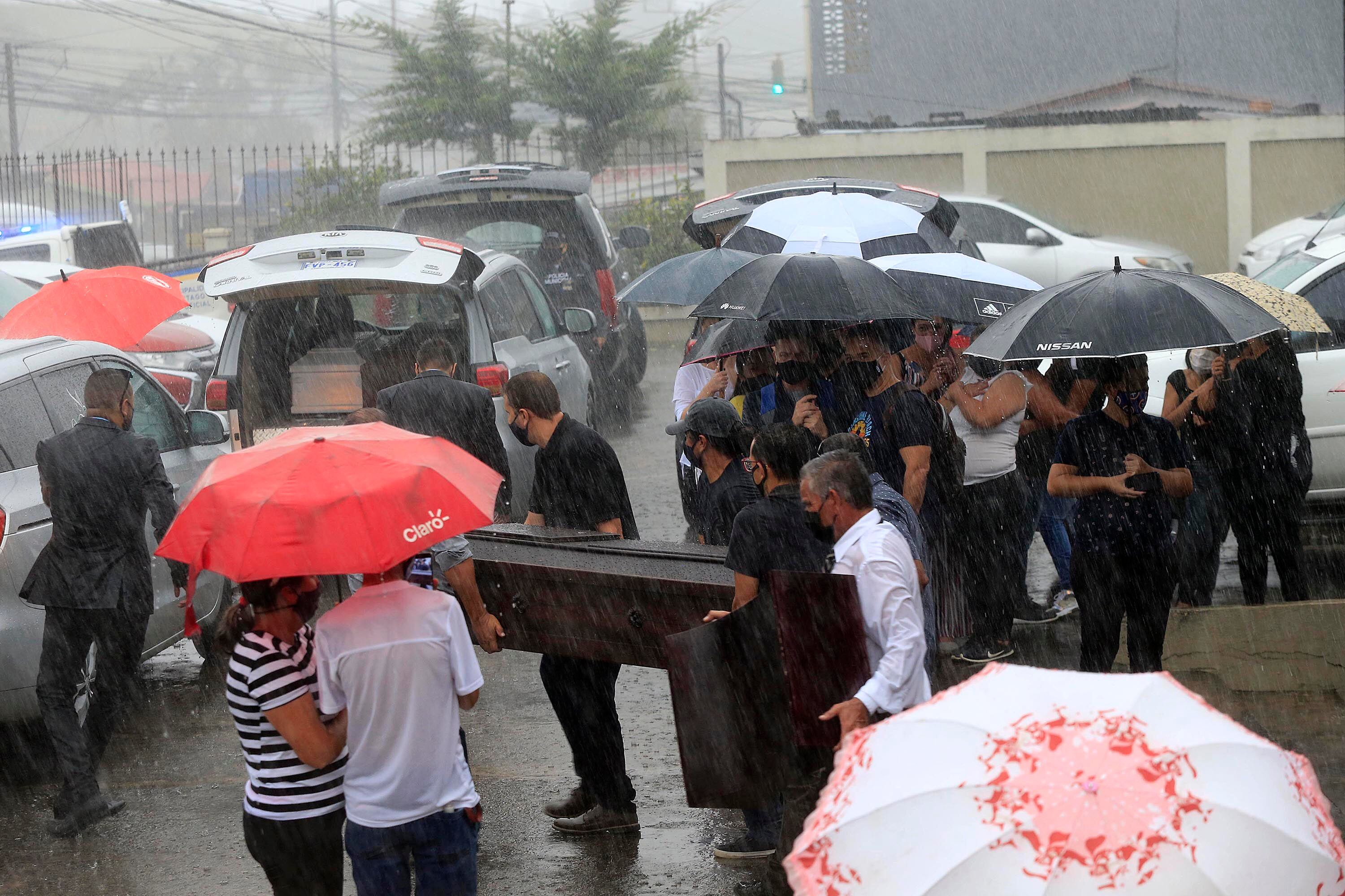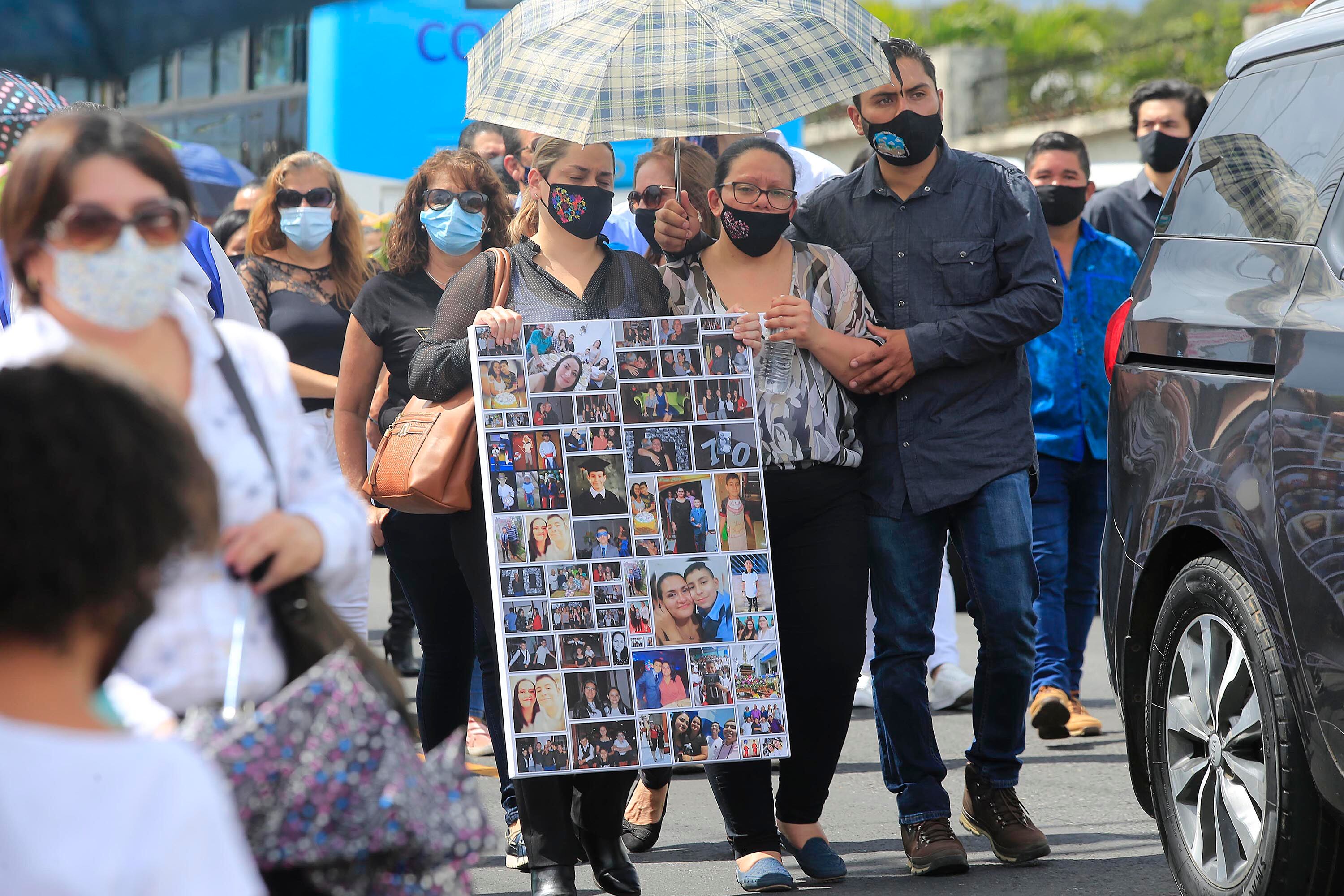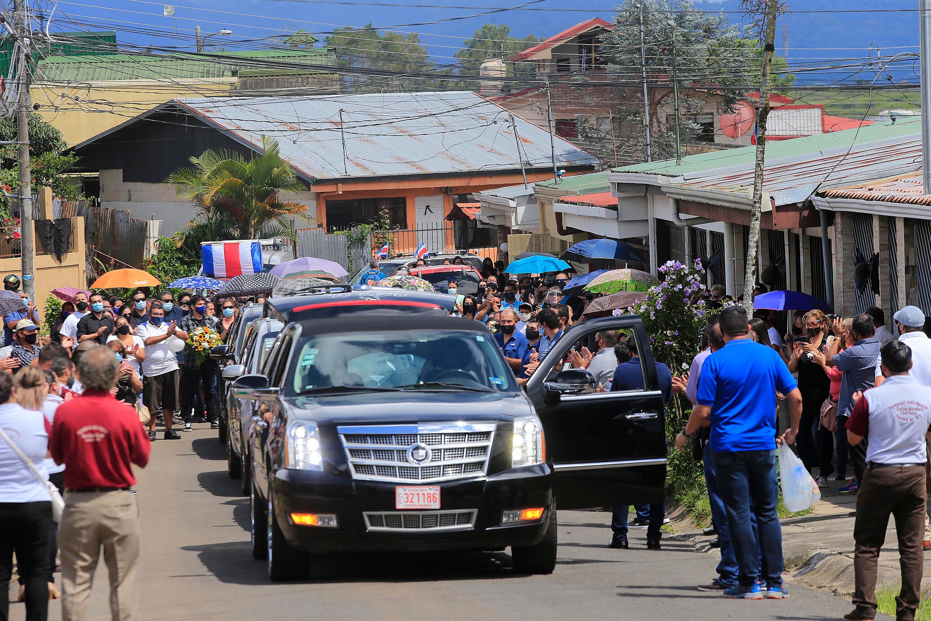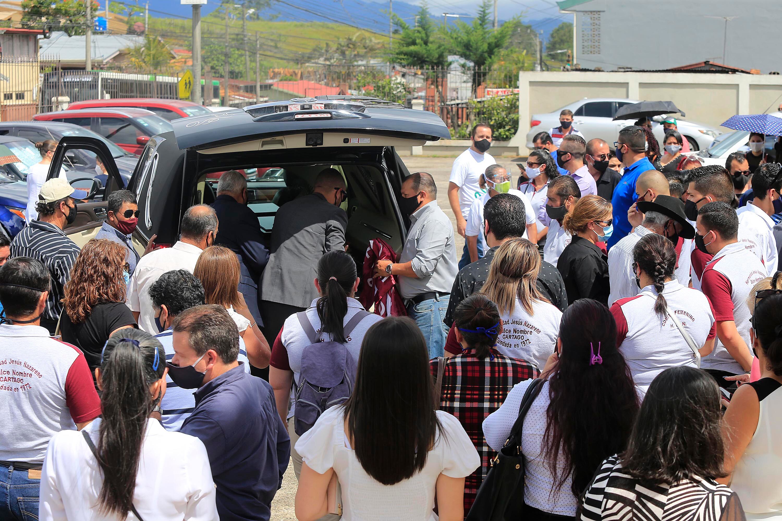 En las afueras de la iglesia, bajo un aguacero fortísimo, se hizo una caravana de decenas de carros con globos para escoltar los cuerpos hasta el camposanto Valle de Paz en Cartago, escoltados por una patrulla de la Policía Municipal.