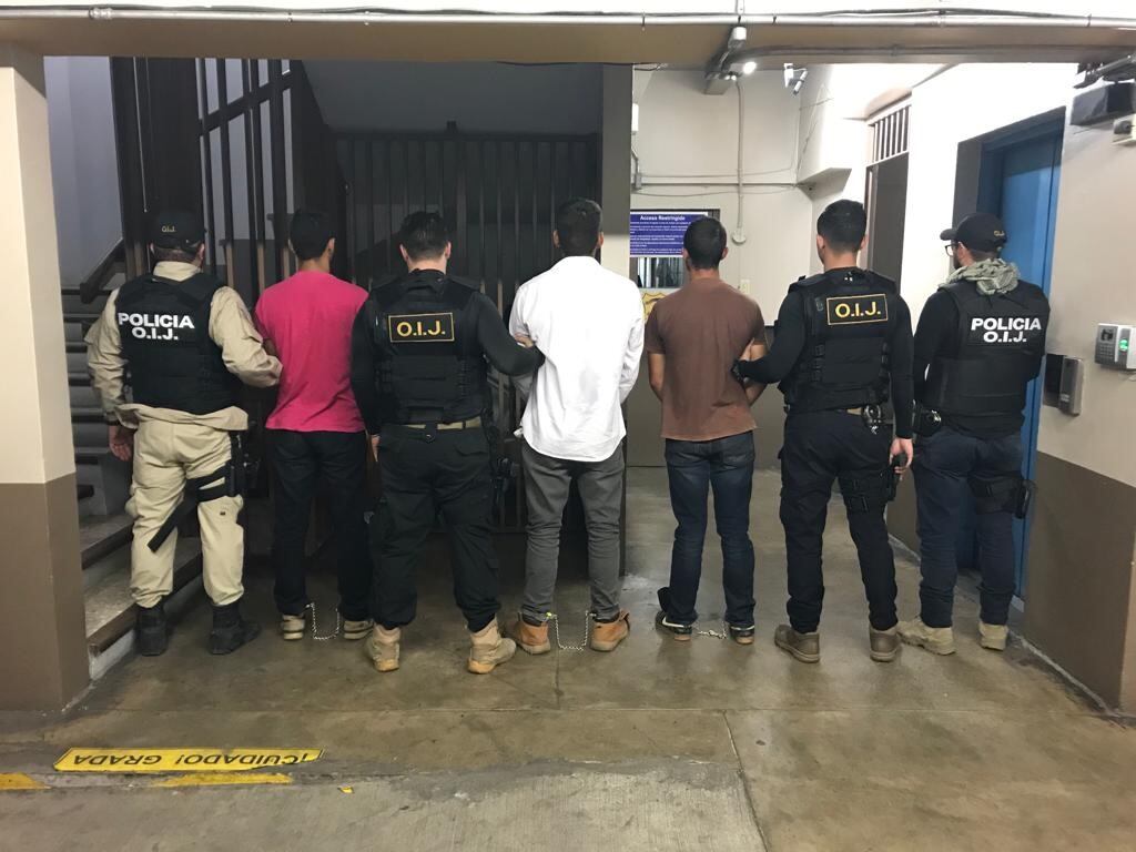 Los detenidos son seis hombres, de apellidos Sandoval Alvarado, Gutiérrez Pizarro, Borbón Navarro, Navarro Naranjo, Calderón Navarro y Ureña Wong y una mujer apellidada Fernández Castro. Todos cayeron en manos de la policía en siete allanamientos realizados en Alajuelita, El Carmen de Goicoechea, Pérez Zeledón, Quircot de Cartago y Palmar Norte de Osa.