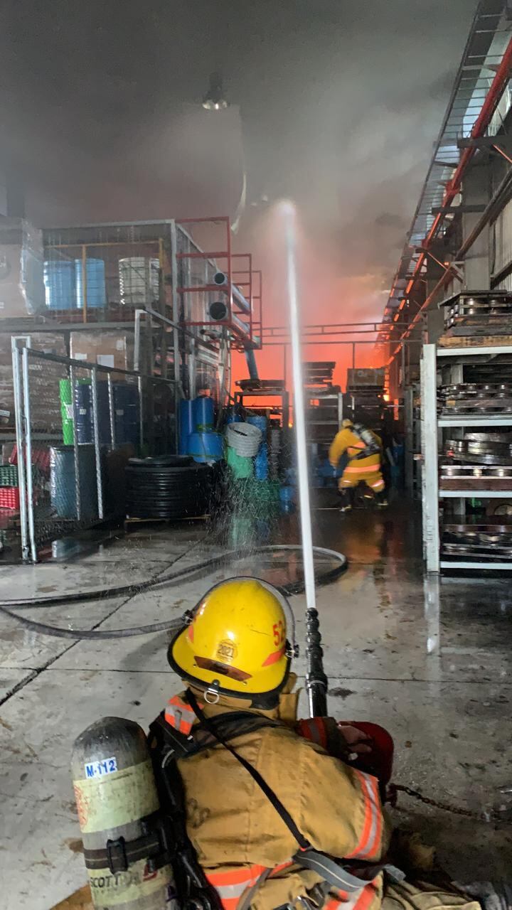 La alerta por el incendio fue dada a las 9:35 de la mañana. Las llamas estaban en una bodega grande en la que se guardaban residuos de hule y caucho para reciclaje.