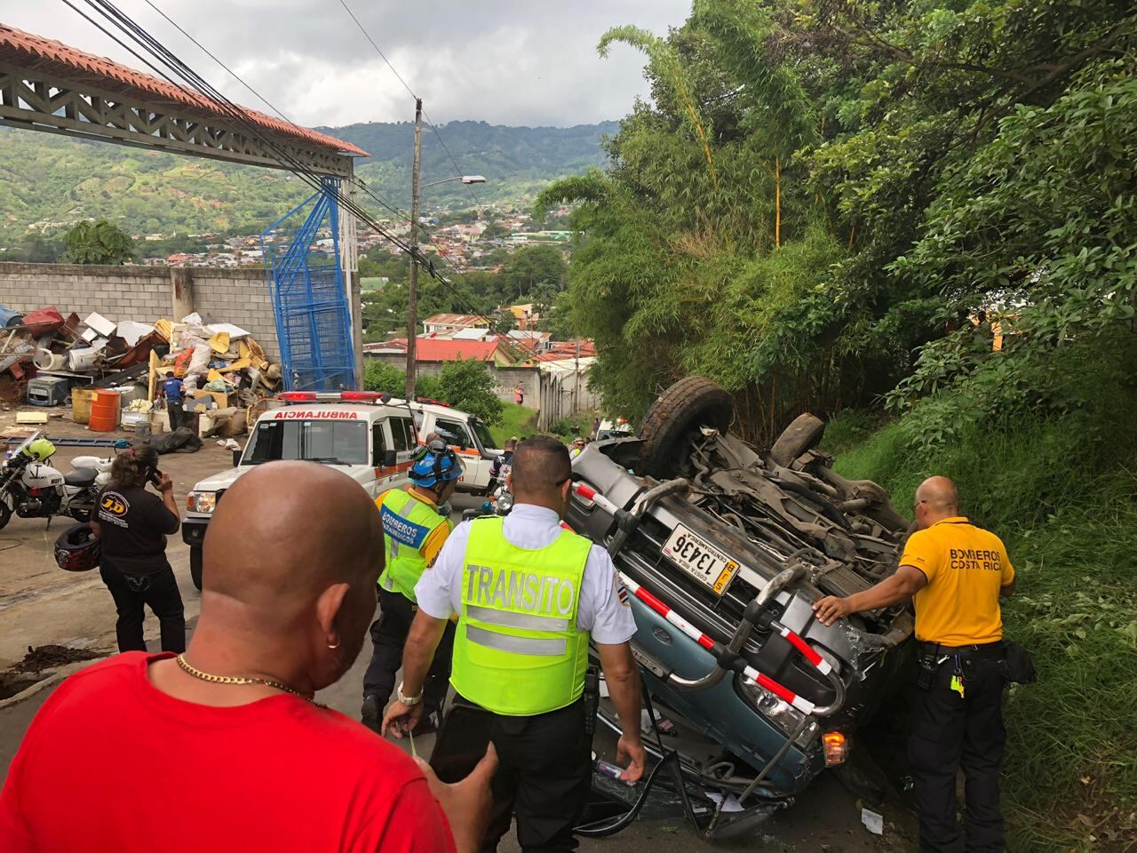 La buseta, conducida por Rafael Fallas, y da servicio a la escuela Corazón de Jesús volcó a un lado de la calle luego de que los frenos no le funcionaran. Esta es una versión preliminar.