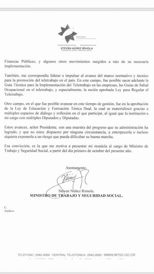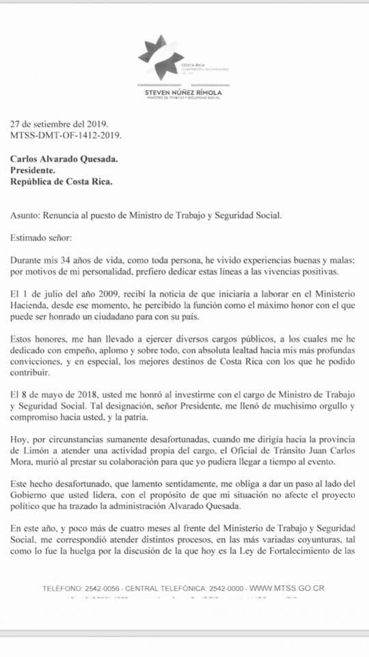 “Hoy, por circunstancias sumamente desafortunadas, cuando me dirigía hacia la provincia de Limón a atender una actividad propia del cargo, el oficial de Tránsito Juan Carlos Mora, murió al prestar su colaboración para que yo pudiera llegar a tiempo al evento”, dice la renuncia.