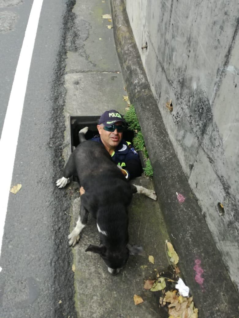 Rosbin Marín, oficial de la Policía Municipal de San José, se convirtió en el héroe de un zaguatico la mañana de este lunes cuando lo sacó de una alcantarilla de más de dos metros de profundidad en Pavas.