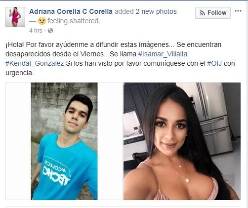 La desaparición de la pareja y el menor se hizo pública la mañana de este lunes cuando la modelo Adriana Corella subió en su perfil de Facebook unas fotos de los hermanos desaparecidos ya que los conocía bastante bien.