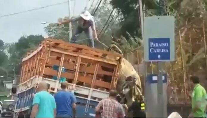 Una vaca de casi 500 kilos puso a sufrir la mañana de este martes a los vecinos de Santiago de Puriscal cuando trató de salirse del camión en el que la llevaban, pero murió asfixiada mientras enfrentaba una requisa policial.