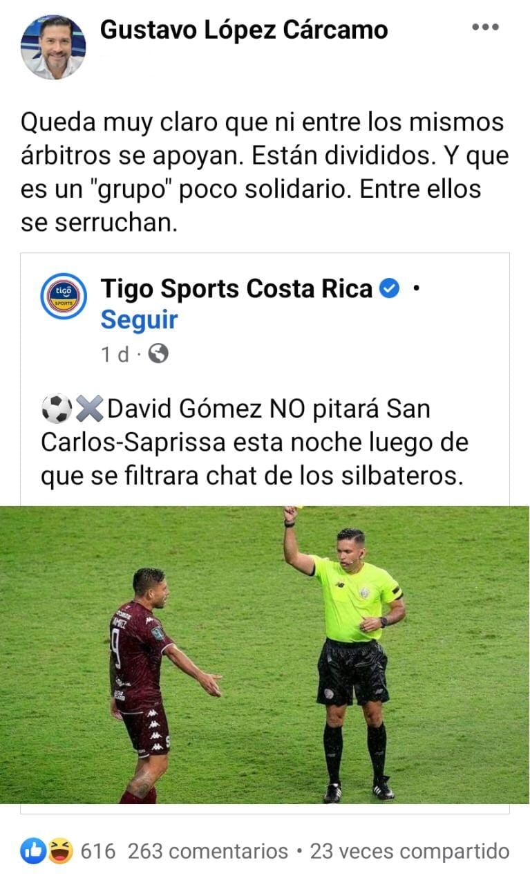 “Queda muy claro que ni entre los mismos árbitros se apoyan, que están divididos y que es un grupo poco solidario. Entre ellos se serruchan”, escribió López en su cuenta de Facebook.