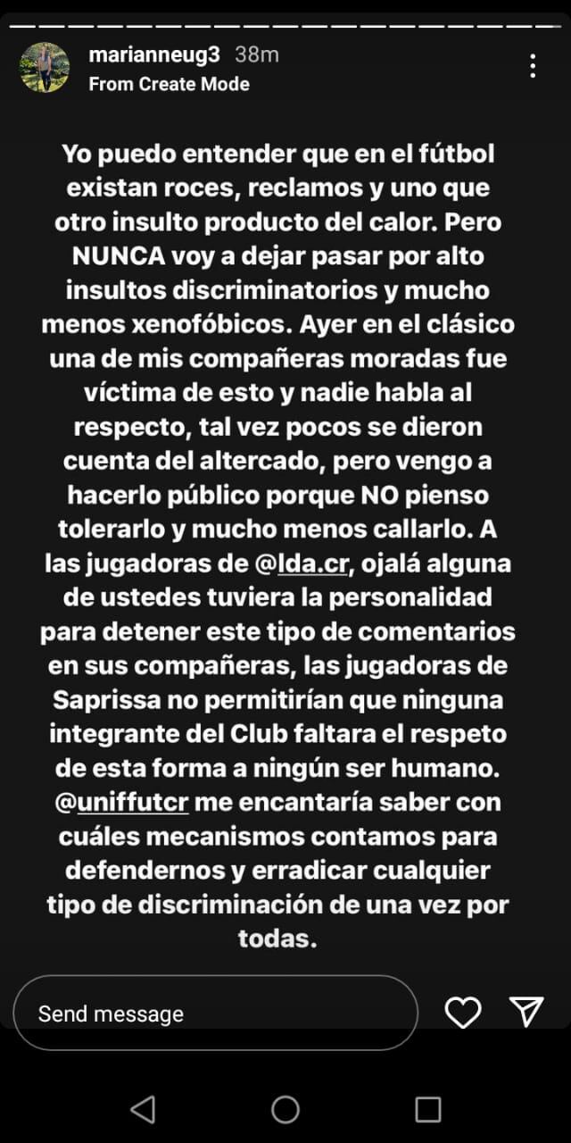 La jugadora del Deportivo Saprissa Marianne Ugalde denunció, en sus redes sociales, que una de sus compañeras fue víctima de insultos xenofóbicos (discriminación a personas de otros países), durante el clásico de este viernes ante la Liga Deportiva Alajuelense.