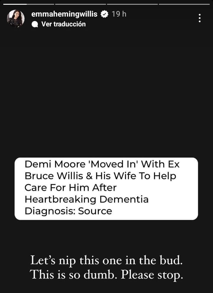 La actual esposa de Bruce Willis, Emma Heming, desmintió que Demi Moore se haya ido a vivir con ellos para cuidar al actor debido a su demencia.