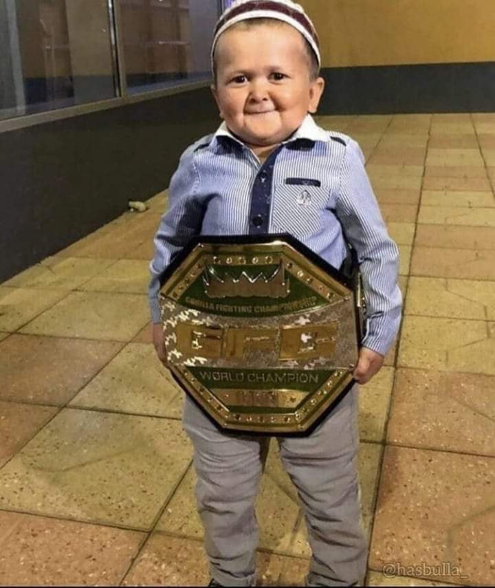 Hasbulla Magomedov nació el 7 de julio de 2002. Producto de la acondroplasia es que a sus 20 años mide aproximadamente un metro y pesa unos 16 kilos.