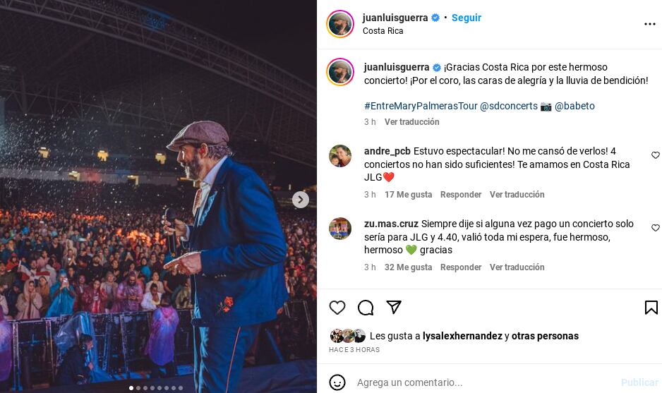 “¡Gracias Costa Rica por este hermoso concierto ! ¡Por el coro, las caras de alegría y la lluvia de bendición!”, expresó el artista de 66 años en una publicación de Instagram.