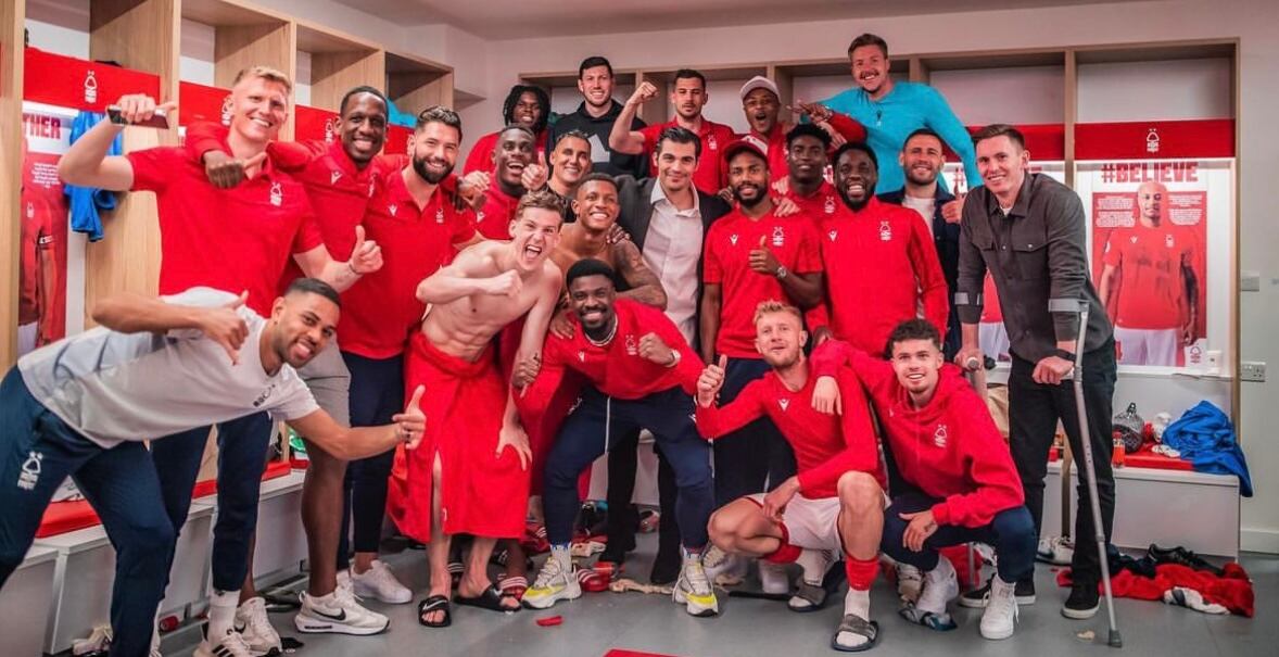 El portero Keylor Navas celebró con sus compañeros el triunfo del Nottingham Forest 1-0 ante el Arsenal, con el cual amarraron su permanencia en la Premier League.