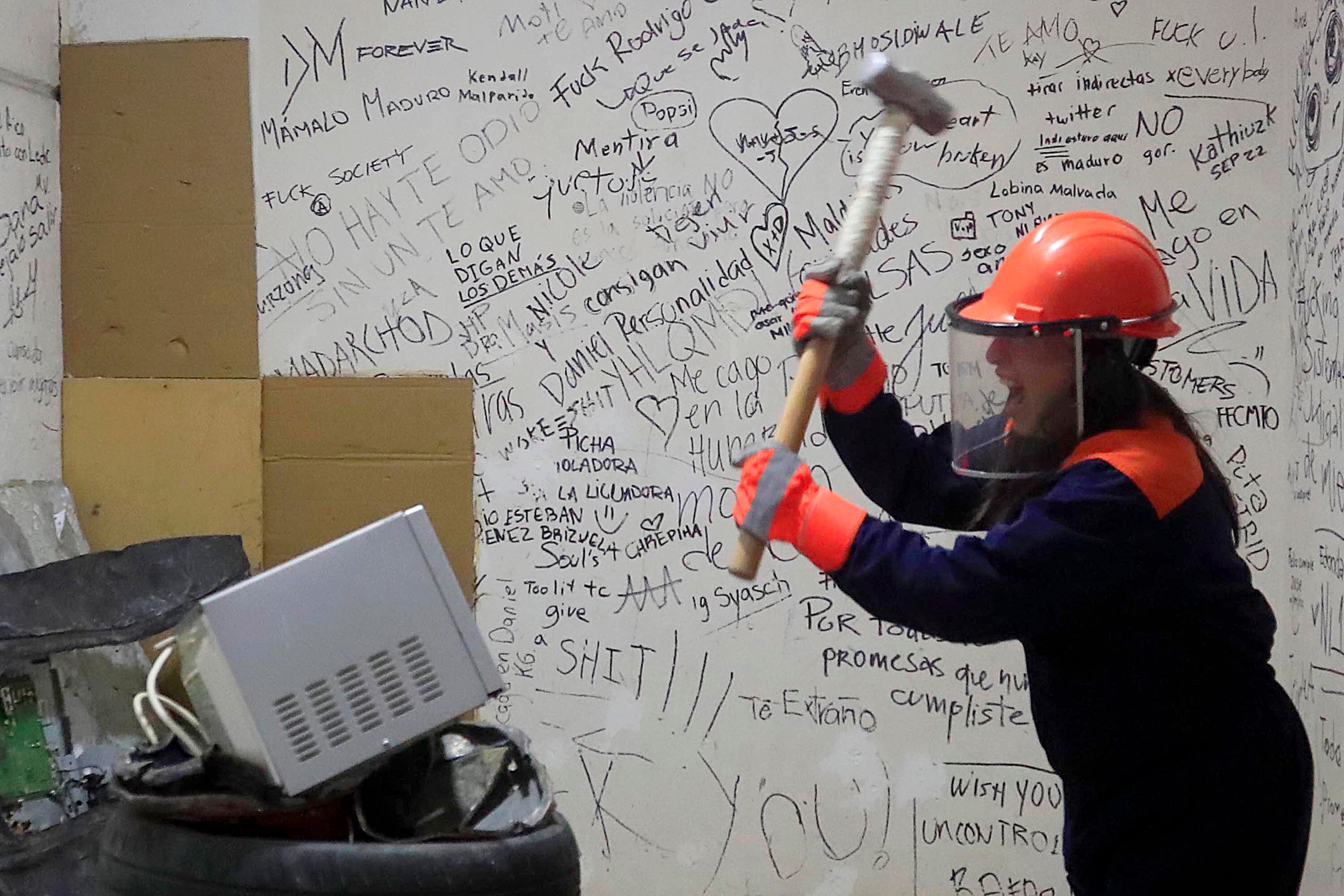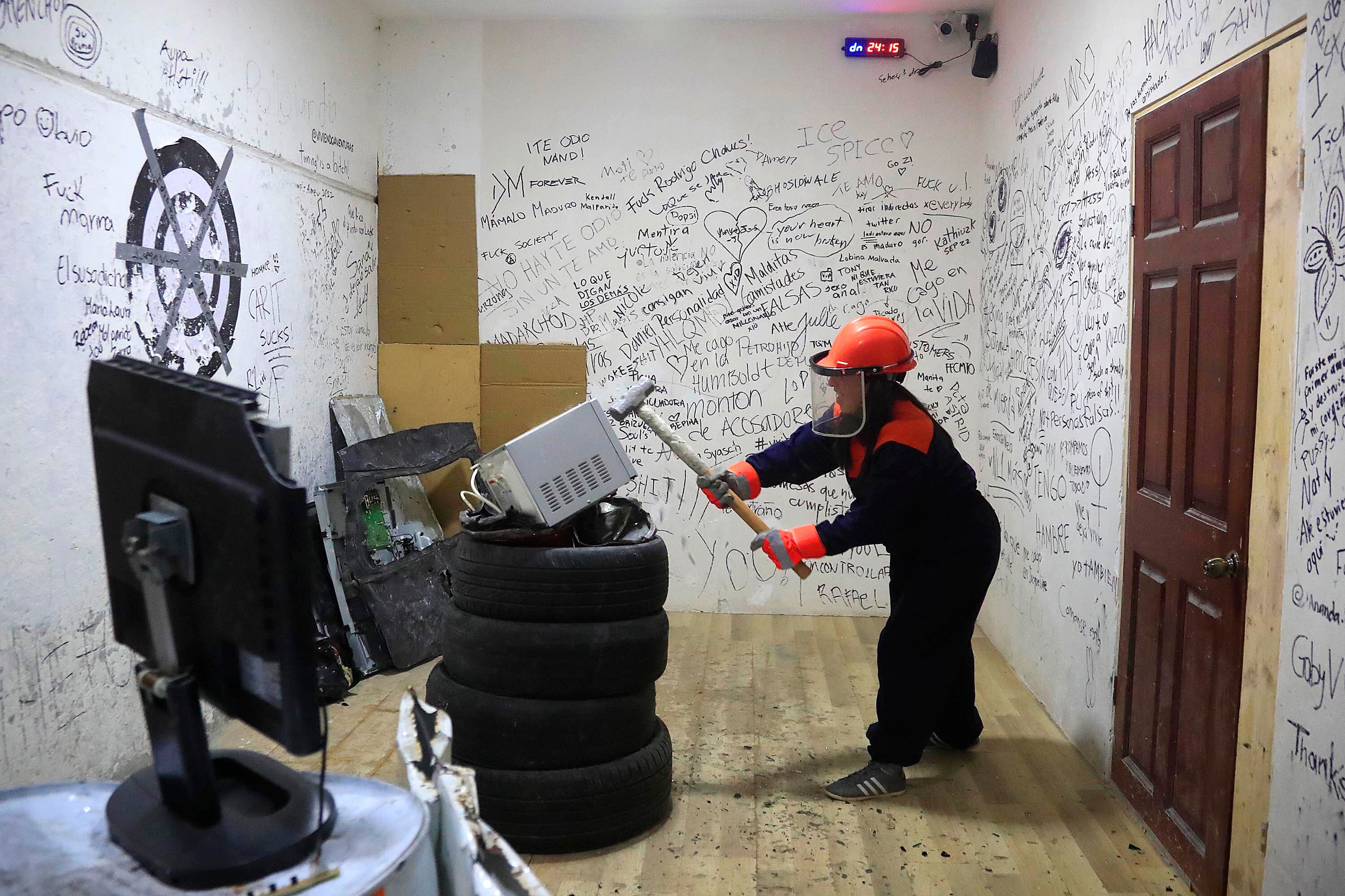 Dentro de los cuartos hay mazos y martillos para que usted haga el desastre. Lo que más disfruté romper fueron las botellas de vidrio y un microondas. También le di con todo a un saco de boxeo y me di gusto pateando la puerta de un carro y golpeando una pantalla de compu.