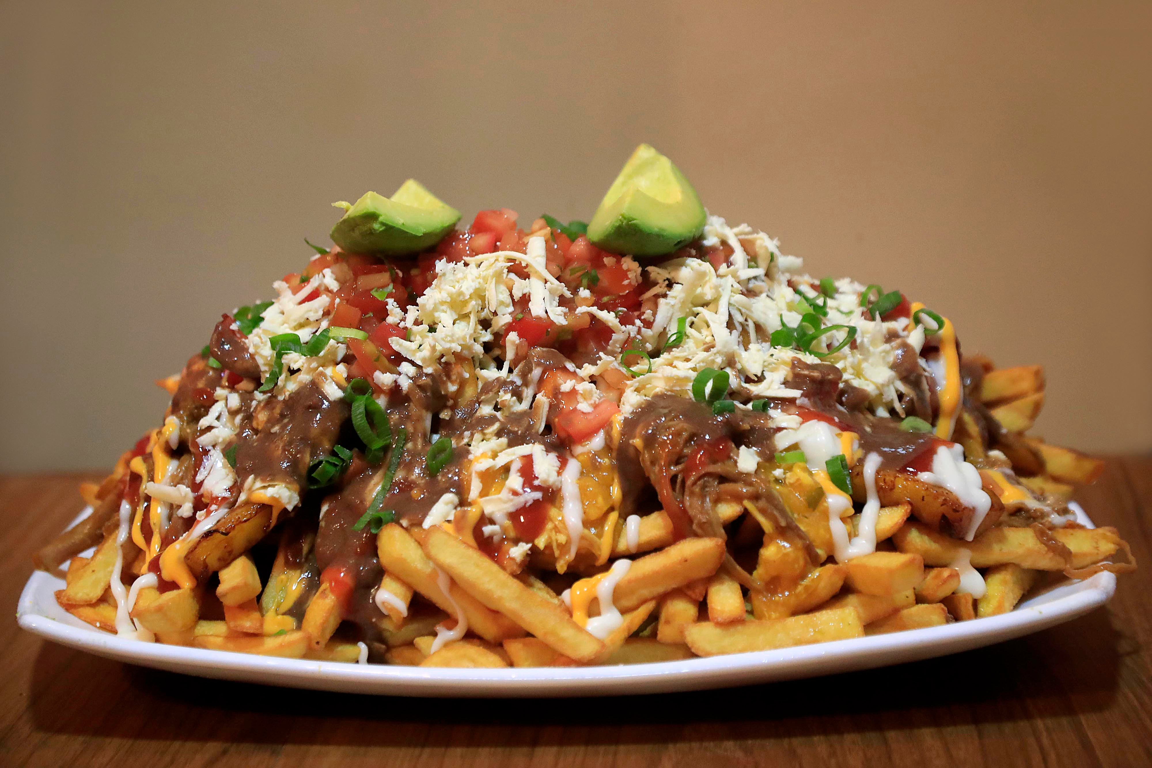 El “Papa L’Patate” tiene, además de muchas papas fritas, plátano maduro, tocineta, chimichurri, carne mechada y molida, pollo, frijoles molidos, tostadas de pan, salsas y aguacate.